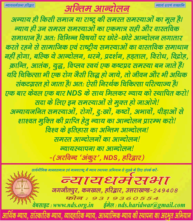 - For the establishment of Justice, we are running the Justice Establishment Campaign by its co-institutions, Nyaya Dharm Sabha(NDS) and Nyaya Dharm Samaaj (NDS).