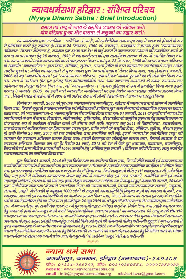 - Nyaya Dharm Sabha has been founded to establish the Social & National Justice. It has only one purpose i.e. the Social & National welfare.