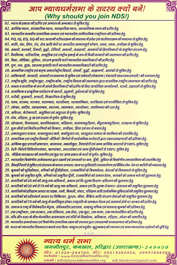 - The Political Party 'Nyaya Dharm Sabha' (NDS) has proposed 111 Justice Proposals to implement the Justice in Society & Nation.